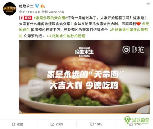 今天中午,《绝地求生》国服官方微博也公布新闻庆贺这一里程碑式的数字,而且公布了春节主题真人宣传片。玩家对此体现出了较高的热忱,微博批评中,玩家最关怀的问题仍然是"甚么时候上线"。