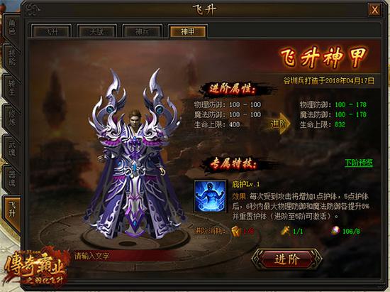 体验转职飞升,亲历羽化成神的奇妙;玩转飞升神殿,与神秘BOSS相约一战……还有不同的神兵和神甲外观显示及专属神兵和神甲特技等待你来激活。